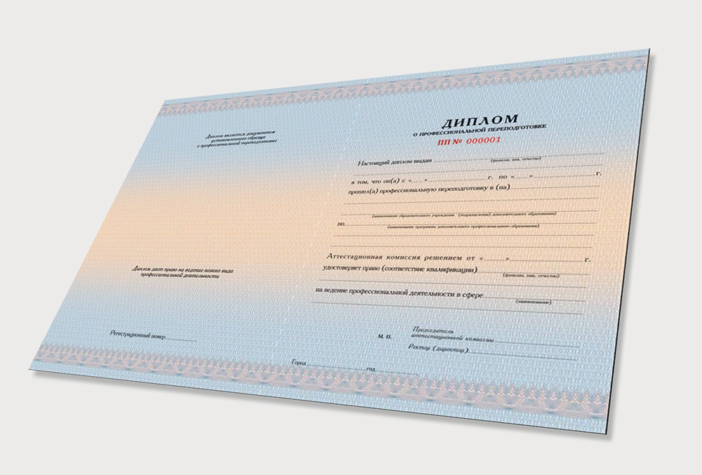 Бланки дипломов о профессиональной переподготовке выпускаются в соответствии с требованиями Федерального закона №273-ФЗ «Об образовании в РФ» и приказами Минобрнауки, регламентирующими обязательные реквизиты и элементы защиты этих документов.